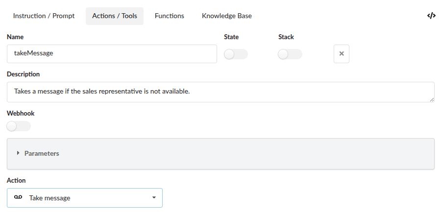 Nachrichtenaufzeichnungen werden im Tools-Abschnitt des Voicebots konfiguriert. Sie definieren einfach eine neue Funktion und beschreiben in der Beschreibung, unter welchen Bedingungen eine Nachricht aufgezeichnet werden soll. Beispiel: Rufe diese Funktion auf, wenn der Anrufer mit einem Vertriebsmitarbeiter sprechen möchte, falls derzeit niemand in der Vertriebsabteilung verfügbar ist.
