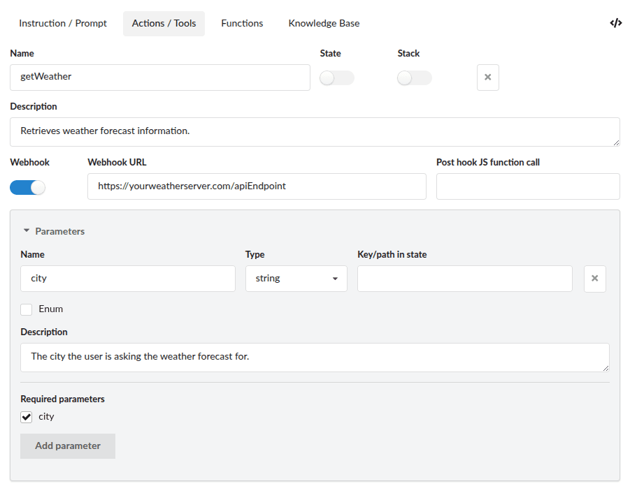 Webhooks können direkt innerhalb einer Funktion/Aktion, die der Voicebot ausführt, konfiguriert werden, indem Sie den Webhook-Schalter aktivieren und die Webhook-URL wie unten gezeigt angeben: