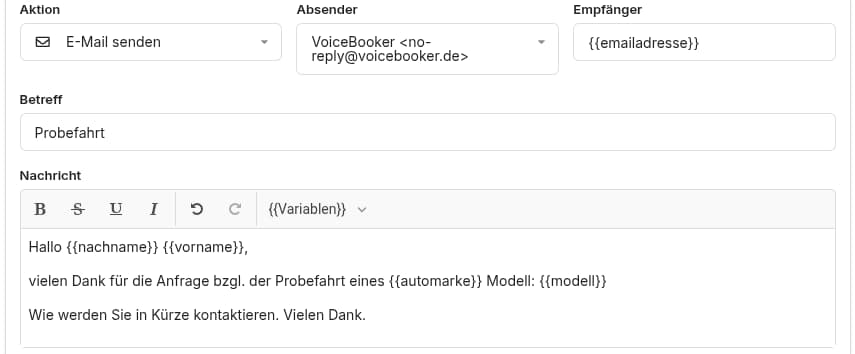 Para ello, podemos usar variables como {{name}} tanto para el destinatario como en el texto del email. La IA las completará con valores durante la conversación para que el email se envíe a la dirección del llamante y su nombre, modelo deseado, etc. aparezcan en el texto. Las variables disponibles se muestran en un menú desplegable, por ejemplo {{first_name}}.