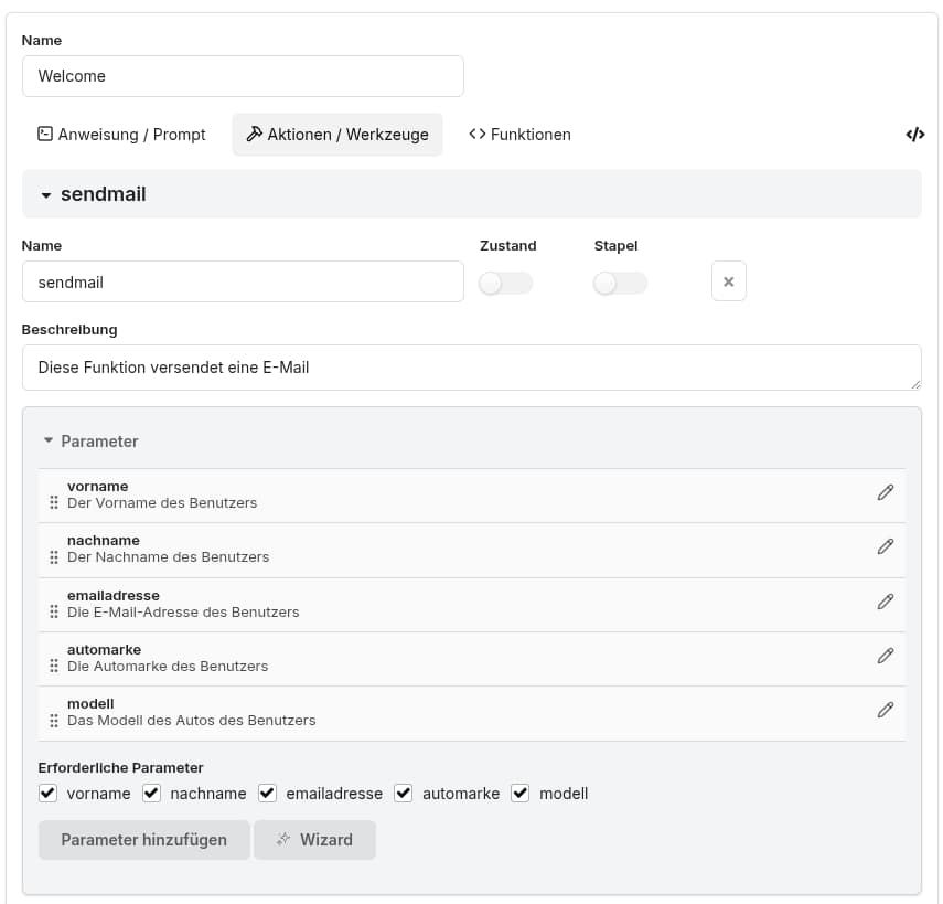 Como la IA debe capturar nombre, apellido, etc., y estos detalles deben aparecer en el email, los datos deben ser extraídos por la IA para que puedan usarse como variables en el texto del email. La IA extrae los datos automáticamente durante la conversación, pero debemos indicar exactamente qué datos deben extraerse: nombre, apellido, etc. Esto se hace mediante los parámetros que definimos en una función.