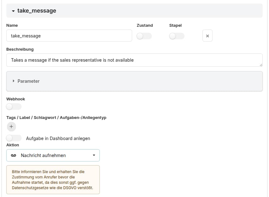 La fonction Prendre un message permet à l’assistant IA d’enregistrer une messagerie vocale classique, par ex. lorsque certains membres du personnel sont indisponibles. Cela garantit que les informations importantes sont capturées et transmises à la bonne personne pour suivi.
