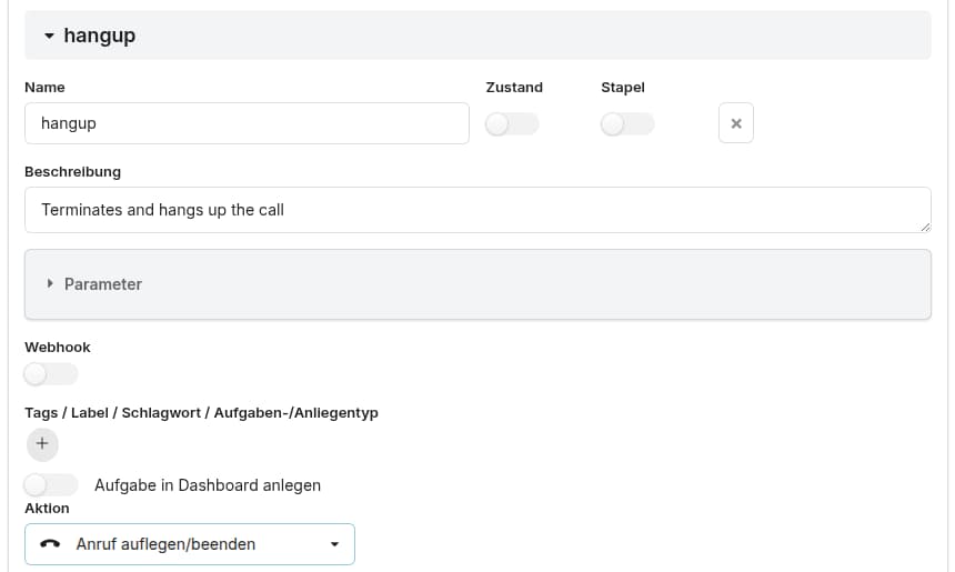 La funzione Riagganciare si configura nella sezione strumenti dell’assistente IA. Definisci una nuova funzione e descrivi nella description in quali condizioni l’assistente IA deve terminare la chiamata. Questo può anche far parte della raccolta di informazioni.