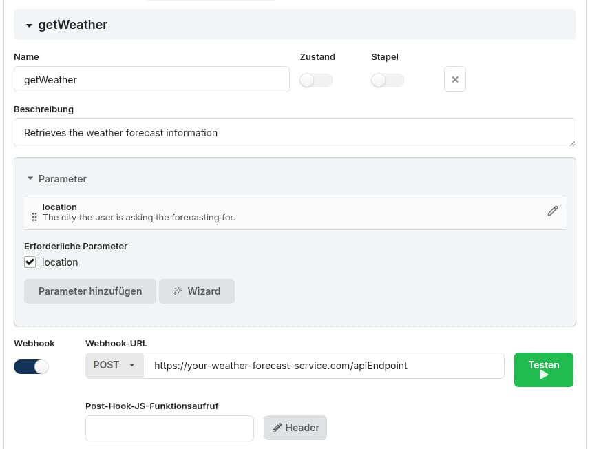 I webhook permettono all’assistente di interagire con sistemi esterni e integrarli nel tuo workflow. Con i webhook, l’assistente può recuperare informazioni aggiornate (ad es. dati cliente, prodotti disponibili o slot liberi) oppure inviare/trasmettere informazioni raccolte (ad es. dopo che un utente ha completato una transazione/prenotazione).